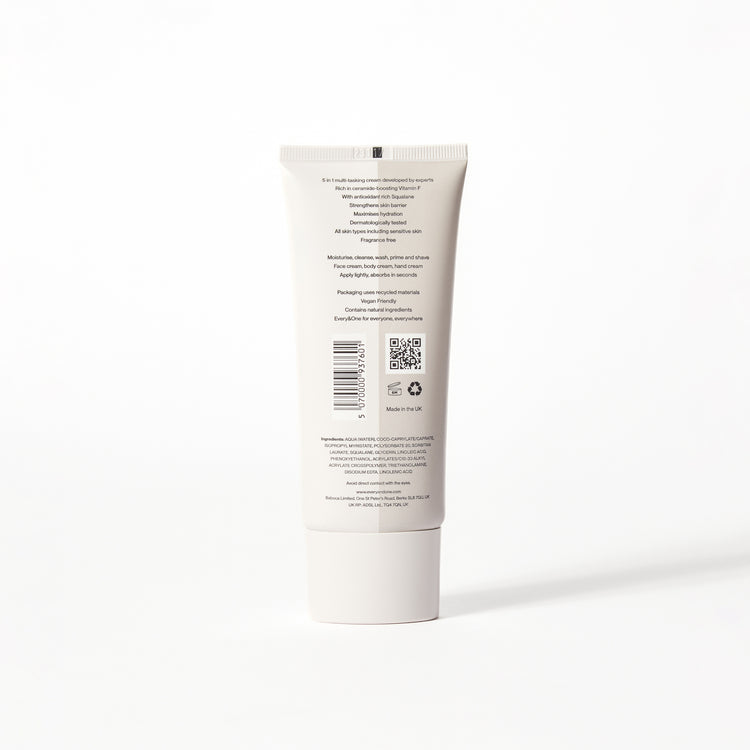 Our one and only sustainable, derma-backed, performance-led face and body cream with Squalane and Vitamin F. For everyone, it enhances moisture levels. Multi-tasking product. One product, five uses: Moisturise. Wash. Cleanse. Shave. Prime. Paraffin-free, vegan-friendly. Perfect for travel.